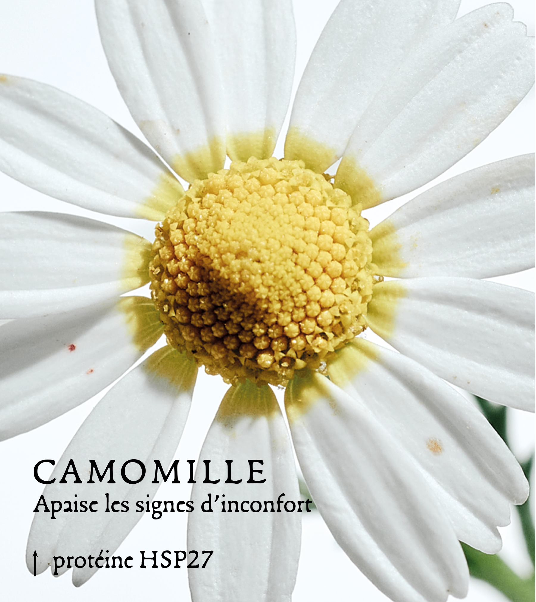 Sur la parcelle, la camomille favorise la biodiversité en attirant les pollinisateurs et en participant à l’équilibre naturel des écosystèmes viticoles. Sur la peau, elle est associée à une modulation de HSP27, SOD2 et NF-κB (↓), contribuant à apaiser les signes d’inconfort et à soutenir la barrière cutanée face aux agressions environnementales.